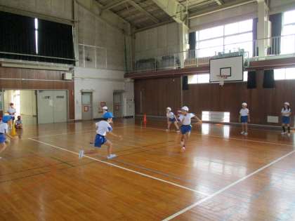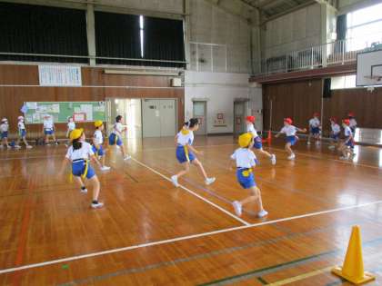 体育科で、スポーツフェスティバルに向けて「タグ取り」の学習をしています。どうすればタグをとられないまま相手陣地を通過できるかを団の仲間と話し合い、試しています。