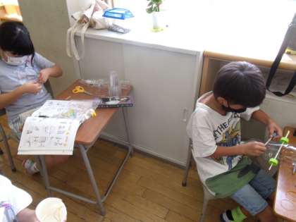 「つくってあそぼう!うごくおもちゃ!」では、輪ゴムやペットボトル等、いろいろな材料を使っておもちゃを作っています。