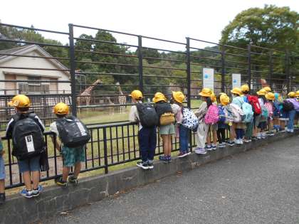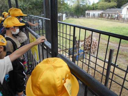 ファミリーパークに着いて、まず、しまうま・きりん舎に行きました。えさを食べているところを近くで見ることができ、子供たちは大喜びでした。