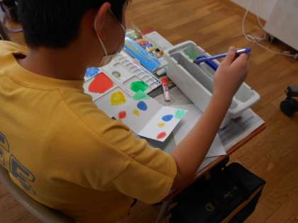 水彩で自由に様々な形や色を表現しました。描いた形や色から、「楽しい感じがする」「うきうきしているのが伝わる」「少し怒っている感じ」など、心のもようを感じ取っていました。