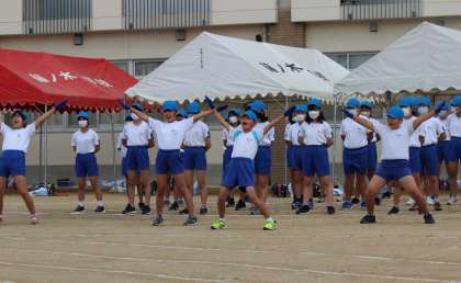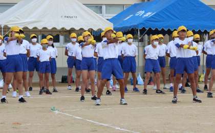 青・黄団の6年生は、3・4年生を激励するエールを送りました。
