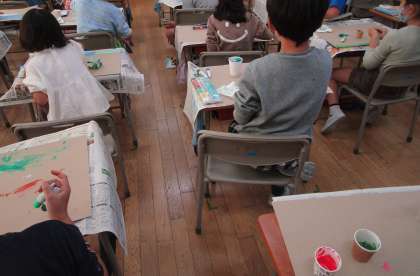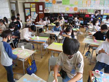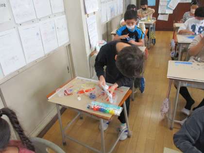 液体粘土に絵の具を混ぜて指や手の平を使って絵を描きました。絵の具の感触をとても楽しんでいました。