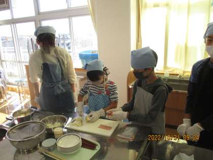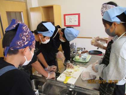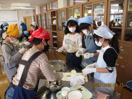 調理実習を行いました。洗う→切る→ゆでる→いためる→味付けするという5つの手順を守って、班で協力して実習に取り組みました。