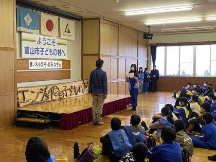 退所式では、お世話になった所の方に感謝の気持ちを伝えました。代表児童があいさつをした後、みんなで「ありがとうございました」と感謝の言葉を伝え、笑顔で所を後にしました。