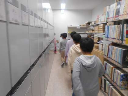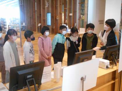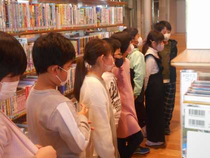 図書館では、本の借り方や棚の見方等、教えていただきました。10冊も借りることができると聞き驚く姿や、学校の図書室より本が多いと喜ぶ姿が見られました。