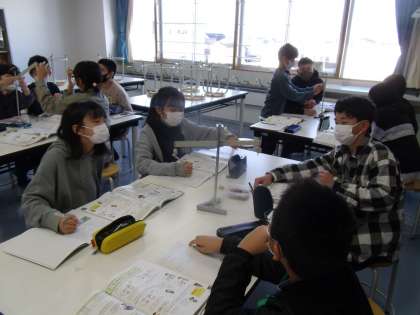 てこが水平に釣り合うときの条件を、安全に気を付けて実験しながら調べました。実験結果をノートに正しく記録することができました。