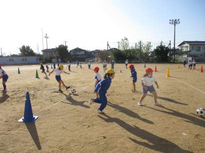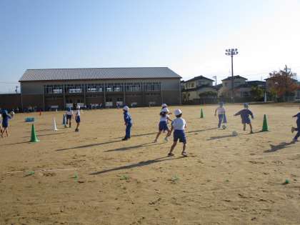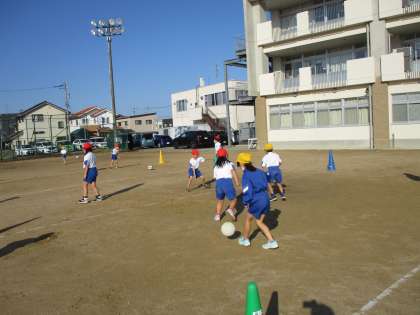 体育科「ボールけりゲーム」では、敵をよけながらボールを蹴ろうと夢中になって走っていました。