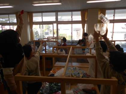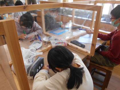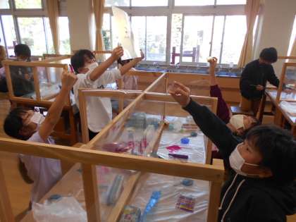 身近にある様々な材料を基に、形付けたり色をぬったりして作品をつくっています。光にかざすと色や見え方が変わることに楽しさを感じ、夢中になって活動に取り組みました。