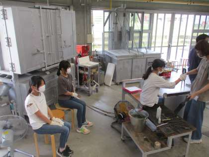 子供たちは、思った以上に暑い工房に驚いてきました。職員の方と一緒に棒を回したり、形を整えたりしました。