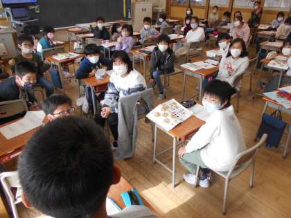小文字のアルファベットの学習を行いました。発音を意識しながら友達とのやりとりを楽しみ、外国語に親しみました。