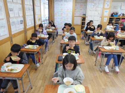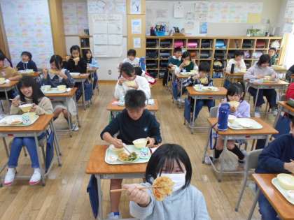 今日の給食は、白エビのかき揚げや富山県産のお米を使ったムース等、富山県の食材が多く使われた給食でした。子供たちは、新鮮な富山の味に舌鼓を打ちました。
