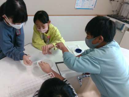 試験管の中の空気を温めると、試験管の口にはった石鹸の膜はどうなるのかを実験しました。手で試験管を温めたり、お湯につけたりしてじっくり観察してどうのように変化が起こるかを調べました。