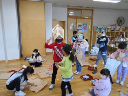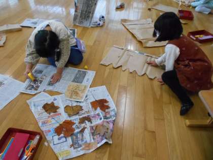 生活科「秋をたのしもう」の学習で、みんなで拾い集めてきた落ち葉を使って、ファッションショーを開くことにしました。いろいろな色や形の落ち葉は、子供たちの手にかかると、エレガントな洋服の模様に、また、格好のよい王冠にとしあがっていきました。まるで、物語の主人公になったような気持ちを味わいながら、楽しく活動しました。