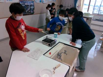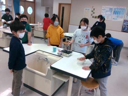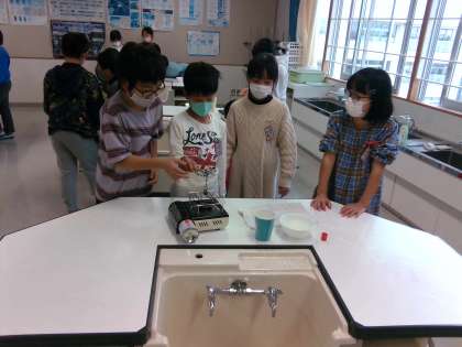 金属をお湯で温めたり、火で熱したりして体積の変化を調べました。班の仲間と協力して、安全に気を付けて実験を進めました。