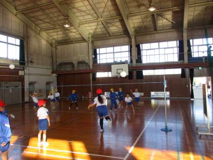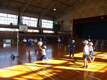 体育科では、「ボール投げ入れゲーム」をしました。相手コートの空いているスペースを見付けて投げ入れたり、ボールを落とさないようにキャッチしたりするなど、練習を重ねるたびに上達していきました。