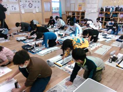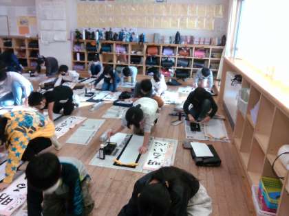 今日の書写では、床に紙を広げて書初めの練習をしました。書くときの姿勢に気を付けて集中して書くことができました。