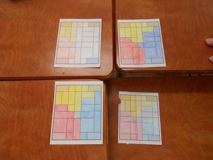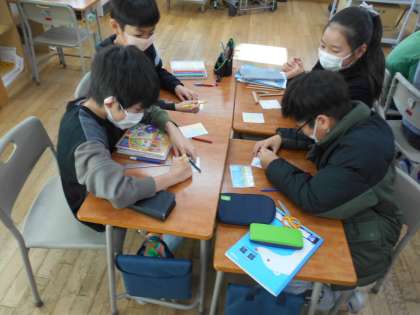 4人グループで陣取りゲームをしました。じゃんけんをして、勝った子供がどんどん色を塗り進めていくゲームです。