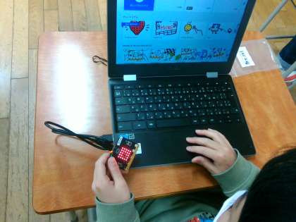 マイクロビットという機械を使って、プログラミングに挑戦しています。LEDを光らせたり、乱数を使ってサイコロを作ったりしています。