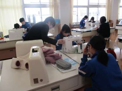 家庭科「ミシンにトライ!」では、エプロン作りに向けてミシンの正しい使い方について学習しています。今日は、下糸を出す練習をしました。