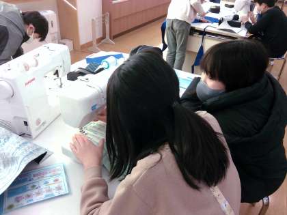 ミシンを使ってエプロンの製作に取り組んでいます。「糸を上手に結ぶことができなかった」「ミシンの糸が絡まってしまった」など、まだ慣れないこともたくさんあります。