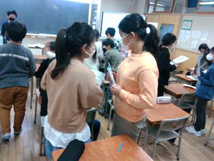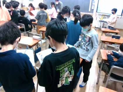 学校の中の好きな場所を尋ね合いました。できるだけ多くの友達に話しかけ、表現に慣れ親しみました。