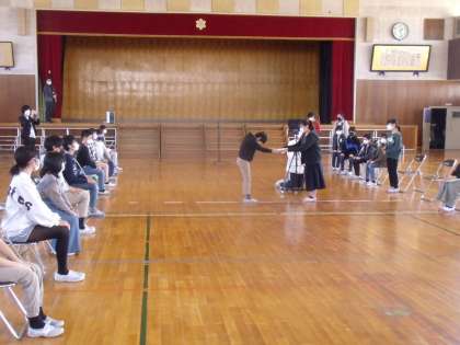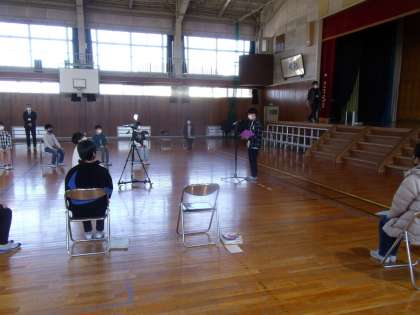 3年ぶりに児童会引き継ぎ式を開き、各委員長が今年度の成果と課題を5年生の副委員長に伝えました。5年生にバトンをしっかり渡すことができました。