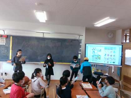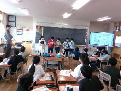 外国語の劇をみんなの前で発表しました。小道具を使ったり発音に気をつけたりして、内容が伝わるように工夫しました。