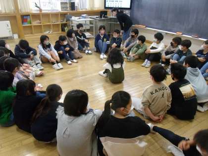 毎週水曜日は、昼休みの時間が長いため、学級のみんなで集会をしました。今日は、ハンカチ落としをして楽しみました。新しい仲間の意外な姿や楽しい姿を見て、仲間の新たな一面を知ることができました。
