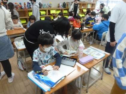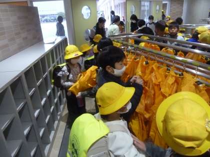 6年生は毎朝、1年生のお世話をしています。雨具やランドセルの片付けを手伝いながら、1年生のみなさんと仲を深められるようにがんばっています。