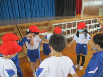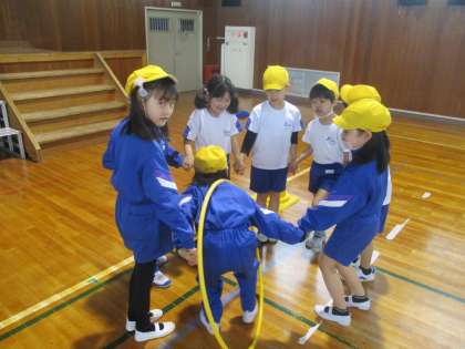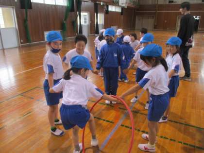 今日は体育の学習で、仲間と協力しながら体を動かしました。手をつないだまま、フラフープを1周させる遊びです。手や体など全身を使っていました。