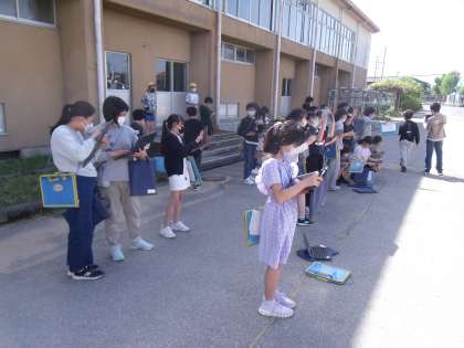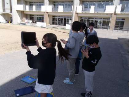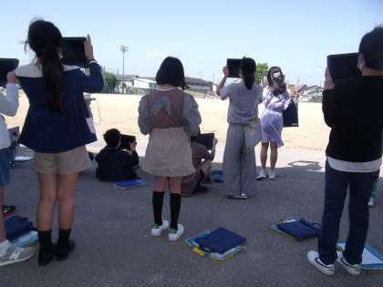 グラウンドに出て、空の観察を行いました。1回目の観察と2回目の観察で雲の位置が違っていることに気付き、それぞれメモをとっていました。