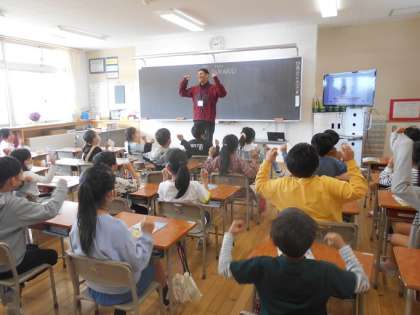 3年生で初めての外国語活動では、ALTの先生の発音を聞いて挨拶をしたり、歌を歌ったりして、英語に親しみました。