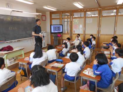 3年生で初めての外国語活動では、ALTの先生の発音を聞いて挨拶をしたり、歌を歌ったりして、英語に親しみました。