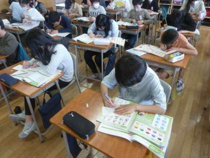外国語の学習で好きな動物や食べ物、自分の誕生日を紹介するカードを作りました。みんな丁寧な字でアルファベッドを書いていました。