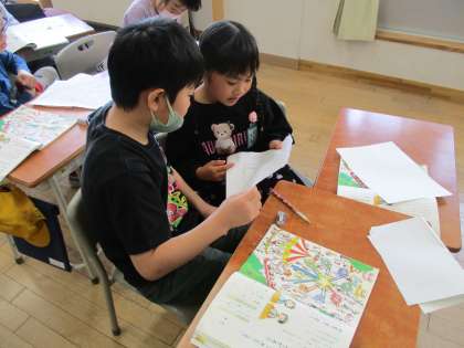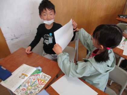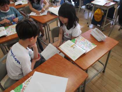 国語の学習では、教科書を見ながら迷子のお知らせ原稿を作りました。ペアでお知らせをし合い、迷子になっている子を探し当てていました。