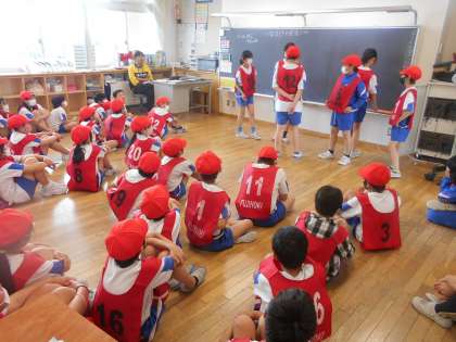 5年生は団体競技でリレーを行います。それぞれの団で作戦や順番を考えて、練習に取り組みました。