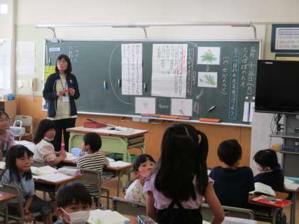 国語の学習では「たんぽぽのちえ」の学習を進めています。たんぽぽの様子やその様子になっているわけを文中から探し出し、考えを伝え合っていました。