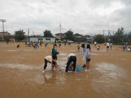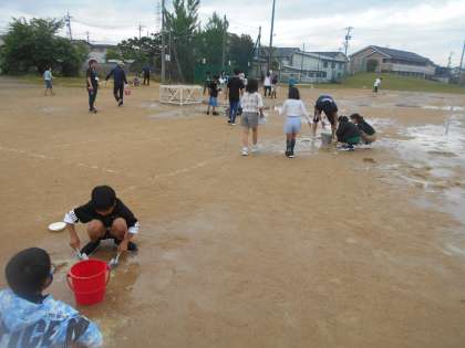 6時間目に明日の運動会にむけて、事前準備を行いました。午前中の雨でグラウンドにたくさんの水たまりができたので、グラウンドの整備を行いました。明日の運動会が楽しみです。