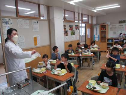 今日は給食中に栄養教諭の先生から話を聞きました。「ひじきはミネラルが豊富だから、明日の運動会で力が出せるよ!」と教わり、残さず食べきっていました。
