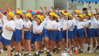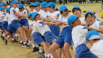 団体競技綱引きでは、それぞれの団が心と力を一つに団結して、一本の綱を全力で引っぱりました。どの団も意気込みの声や移動の動きなどから気合いが感じられました。