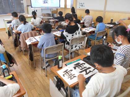 書写の学習で「雲」を書きました。上下の組み立て方に気を付けて最後まで丁寧に筆を運びました。