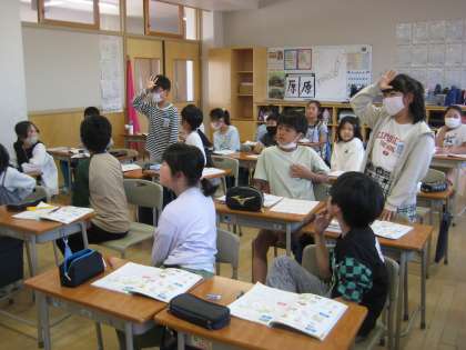 遊びや天気の言い方を学習しました。2グループに分かれて早押しクイズをしました。