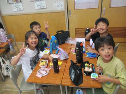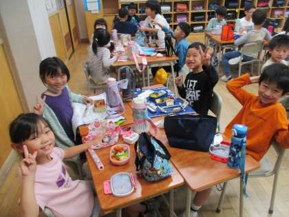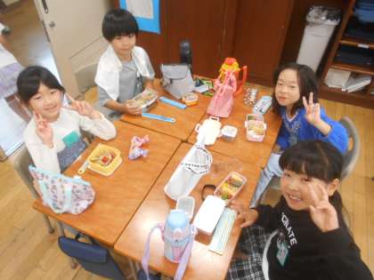 雨のため遠足は延期となってしまいましたが、お昼ご飯はお弁当でした。友達とお弁当を見せ合いながら楽しそうに食事をしていました。