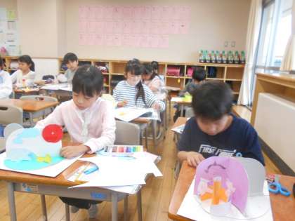 図画工作科では、割ピンを使って用紙が回る動きを生かした「くるくるランド」に取り組みました。回ることで場面や向きが変えられる特徴の面白さを感じながらつくりました。