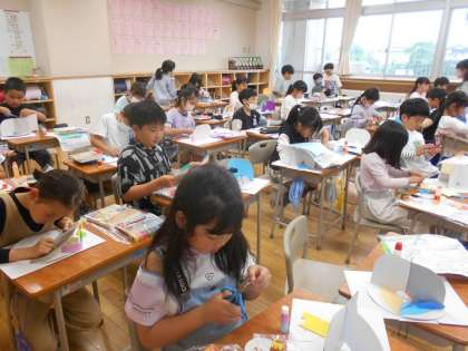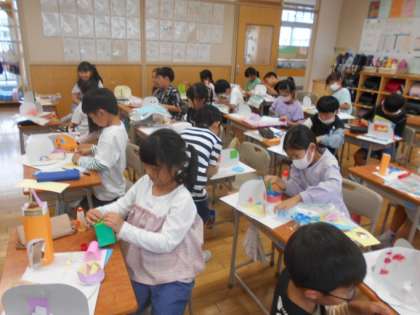 図画工作科では、割ピンを使って用紙が回る動きを生かした「くるくるランド」に取り組みました。回ることで場面や向きが変えられる特徴の面白さを感じながらつくりました。