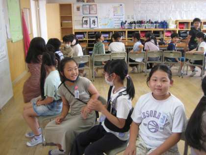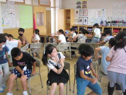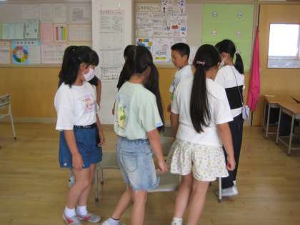 クラスのみんなで椅子取りゲームをしました。いつ曲が止まるのかどきどきしながら楽しみました。