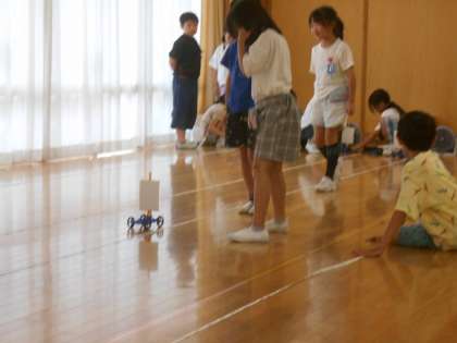理科では、風の力の強さによって車の動き方がどのように変わるのか、実験しました。