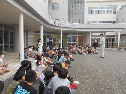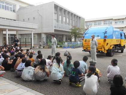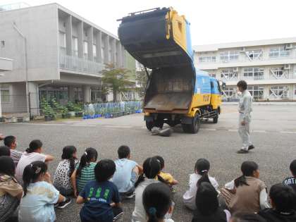 3R推進スクールでは、ごみ収集車の見学もさせていただきました。大きく開いた収集車を見て、「お〜!!」と歓声が上がりました。