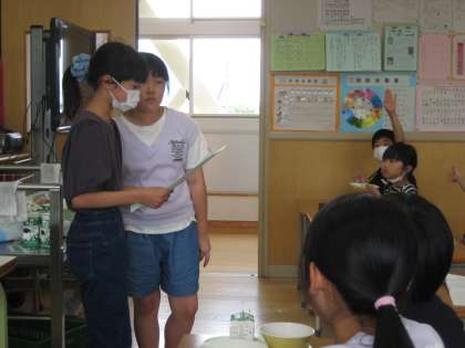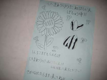 1組の子供たちが「ひまわりの種がほしい人を募集中です。」と案内をしに来てくれました。「早く欲しい」と言って喜んで行き、「もらったよ嬉しい」と喜んで帰ってきました。