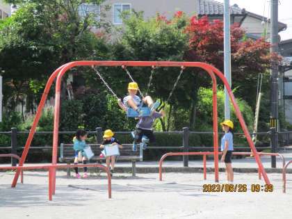 生活科のまちたんけんにでかけました。パート1では、大阪屋ショップから藤木園町公園、さらに神明社の方まで足をのばし、自分たちの住むまちの素敵なところや、おもしろいものを見付けました。藤木園町公園では、短い時間でしたが、思い切り遊ぶ様子が見られ、楽しい遊具に夢中になっていました。